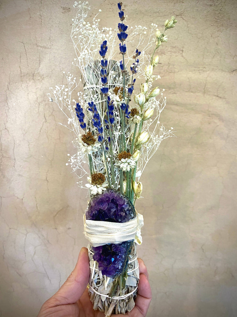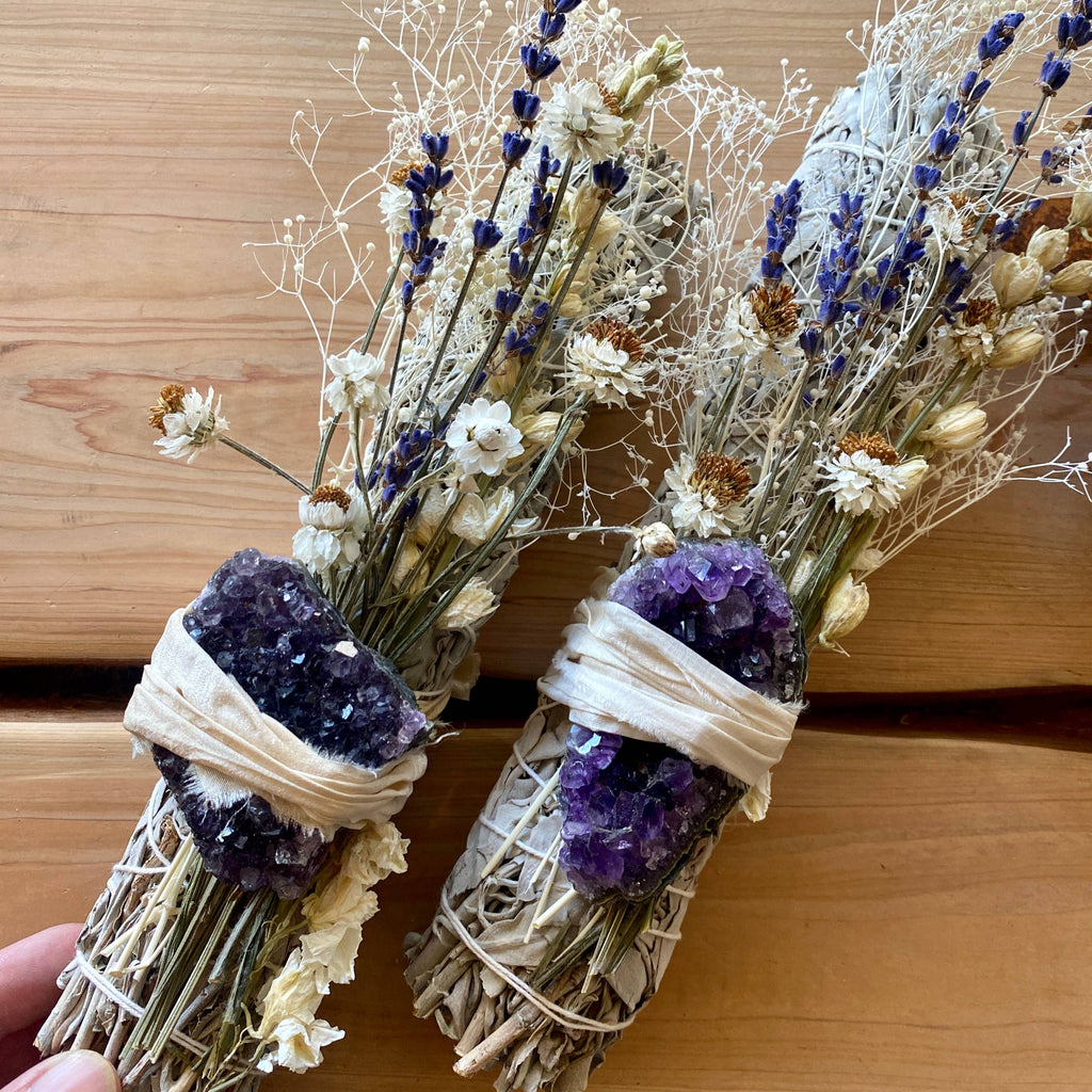 These hand tied sustainably harvested California white sage smoke cleansing bundles are not just beautiful but wonderful energy cleansing tools. Each one is unique and full of natural magic and love. Various ancient cultures have used sacred sage to purify, cleanse and protect oneself or a special space throughout history. Smoke cleansing is like taking an energetic bath. Simply untie the bundle and smudge your space with the white sage. Maybe save your dried flowers in a tiny bud vase to enjoy or burn them with the sage. This bundle is known as our 'Healing + Protection' bundle because it includes a piece of majestic purple amethyst. Amethyst is known throughout time as the master healing and protective stone. These bundles make great housewarming gifts. Each one is unique and made with different wildflowers and wrapped with recycled silk sari ribbon. Information and instructions will be included. You will receive one bundle approximately 9” in length.