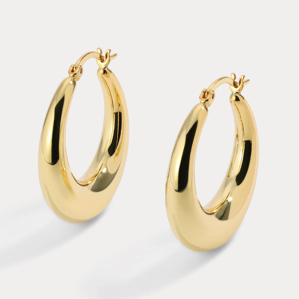 Hollow hoop earrings with curved bottom, in 14kt gold or rhodium plated Sterling Silver. Flattering on every lobe. Earrings measure 1.25" in diameter Latch post fastening Lightweight