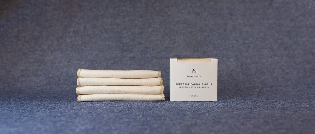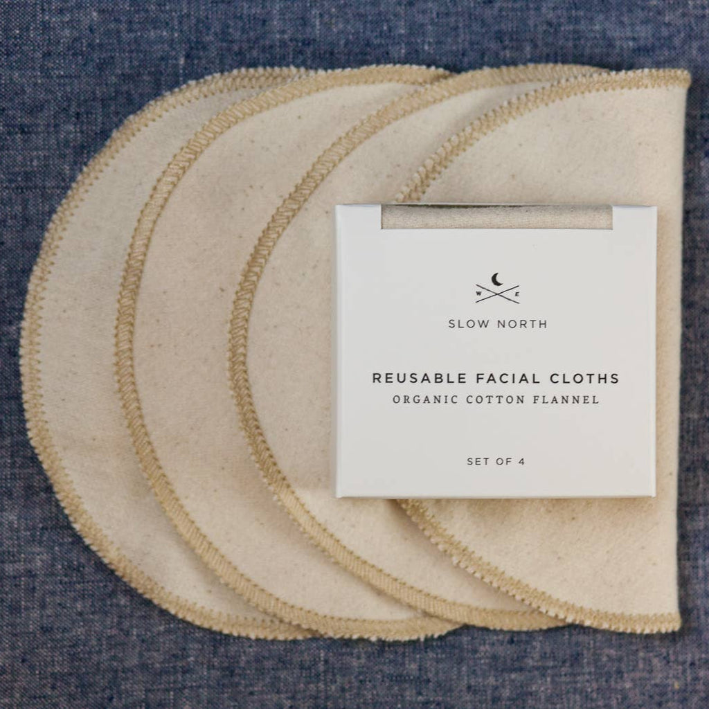 Introducing our new round facial cloths! These eco-friendly, reusable cloths can be used with face wash, and toner, to help remove makeup, and in other ways during your own skincare routine! A great substitute for disposable makeup wipes, cotton balls, and cotton facial rounds. These soft facial cloths are made by our team in the Slow North studio with 100% organic, natural cotton flannel. The set of four is machine washable and a perfect accessory to the zero-waste bathroom.