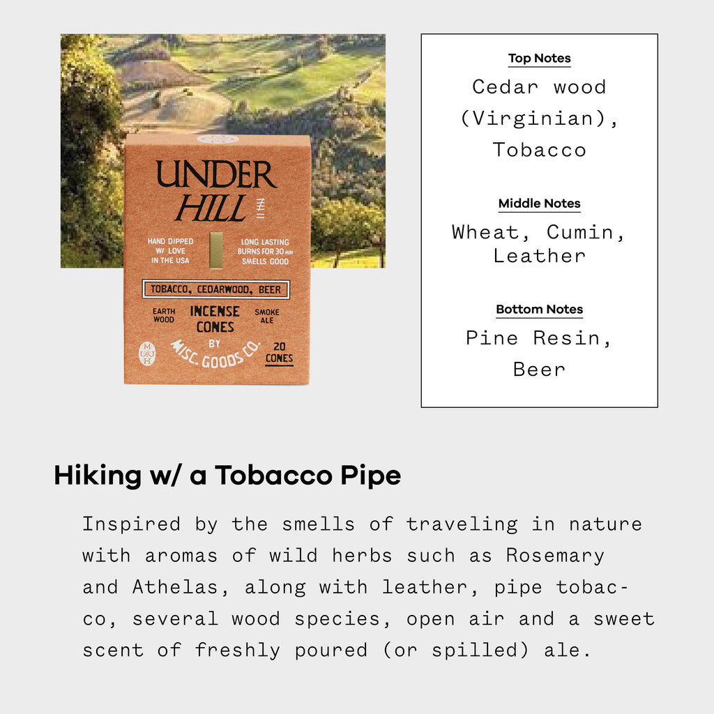 Keywords: Underhill incense cones, earthy natural incense, leather and tobacco scent, herbal incense blend, forest-inspired fragrance, clean burning cones, small batch incense, USA-made home scent
